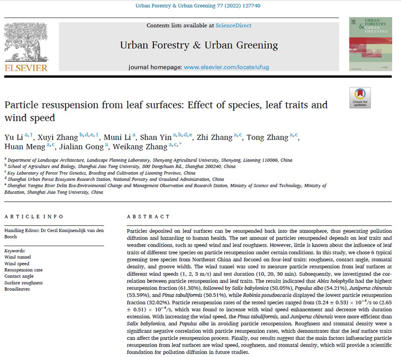 近日,林学、风景园林学类顶级期刊Urban Forestry & Urban Greening在线发表了韦德官方网站风景园林规划设计团队地景规划研究室(Landscape Planning Laboratory)青年教师张维康博士为通讯作者的研究论文“Particle resuspension from leaf surfaces: Effect of species, leaf traits and wind speed”。韦德官方网站博士研究生李玉,上海交通大学博士研究生章旭毅为共同第一作者。地景规划研究室教师张智、张桐、孟焕,风景园林硕士研究生李沐倪,龚嘉莲,上海交通大学教师殷杉为共同作者。
