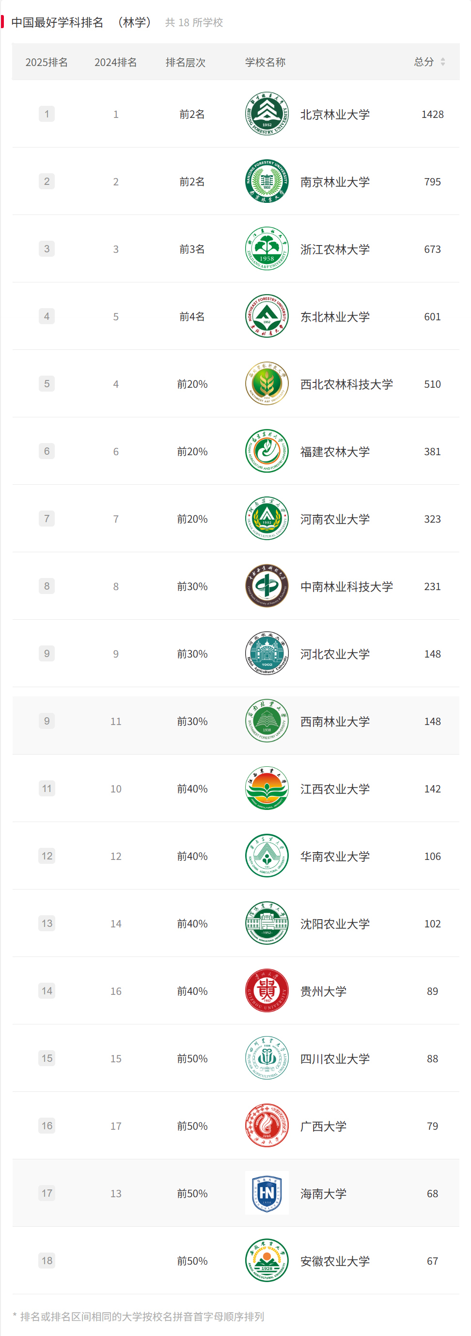 近日,高等教育专业评价机构软科正式发布“2025中国最好学科排名”。韦德官方网站林学学科排名全国第13位,得分突破100,稳居前40%,展现出稳步提升的良好势头。