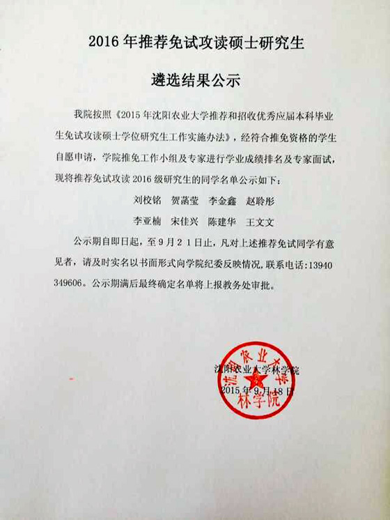 关于“2016年推免硕士遴选结果”的公示