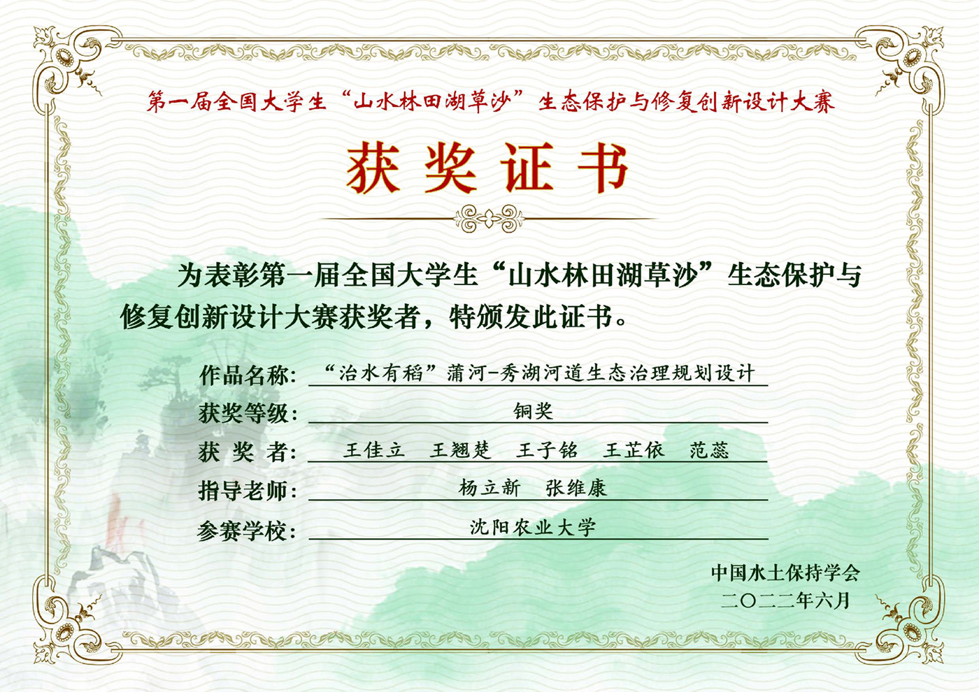 近日,在首届全国大学生“山水林田湖草沙”生态保护与修复创新设计大赛决赛中,韦德官方网站风景园林学科教师杨立新、张维康指导研究生王佳立、王翘楚、王子铭、王芷依、范蕊完成的作品斩获铜奖。