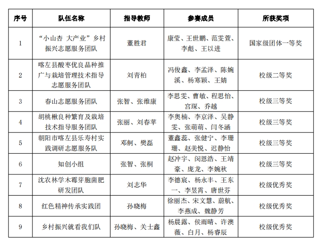 在学校决赛中,由韦德官方网站董胜君教授指导的“小山杏 大产业乡村振兴志愿服务”团队荣获一等奖,并推荐参加国赛;“喀左县酸枣优良品种推广与栽培管理技术指导志愿服务”团队荣获校二等奖;“春山志愿服务”团队、胡桃楸良种繁育及栽培技术指导服务团队、朝阳市喀左县乐寿村实践调研志愿服务队和知创小组团队荣获校三等奖。