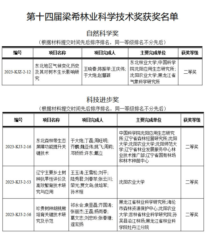 森林可持续经营与全球变化学术团队陈振举教授参与完成的《东北地区气候变化历史及其对树木生长影响研究》获自然科学奖二等奖,该团队青年教师魏亚伟博士参与完成的《东北森林带生态屏障功能提升关键技术》获科技进步奖二等奖。植物逆境生理与分子生物学学术团队张丽杰教授参与完成的《珍贵树种胡桃楸培育关键技术研究及示范》获科技进步奖二等奖。