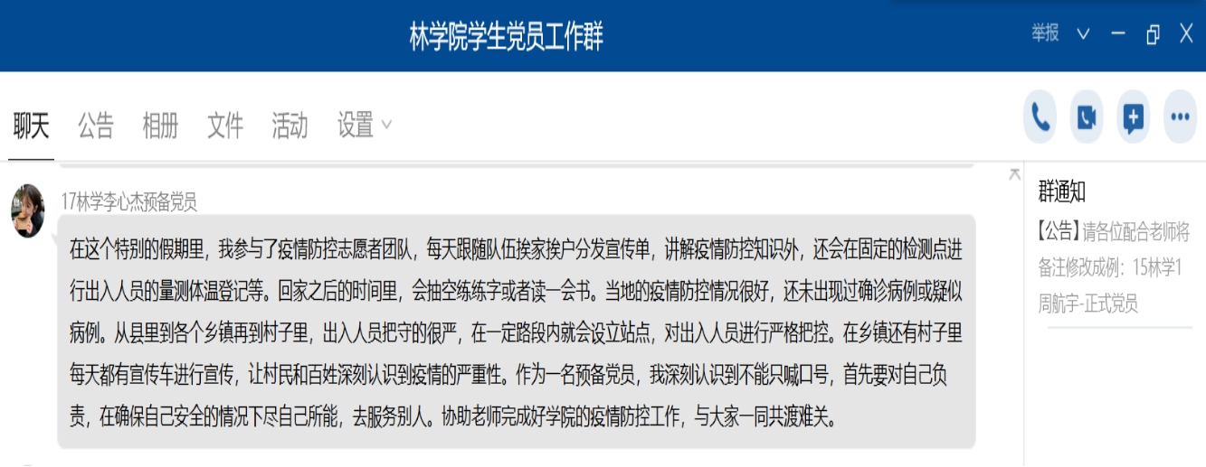 本次会议由韦德网站(中国)官方本科生党支部书记胡凯老师主持召开,胡老师从假期活动分享、当地疫情防控情况介绍以及作为党员该如何面对这场疫情三个方面布置了本次主题党日的活动内容,要求党员同学围绕这三个方面在群中发言讨论,集中学习。同学们积极踊跃,气氛热烈。胡凯老师对同学们的发言一一进行了回复,悉心交流,对于担任班级干部的党员同学,强调关注班级每名同学的健康以及心理情况,为下学期的工作做好计划;鼓励考研、保研的同学要好利用这个“特殊又难得”的假期好好充电,让自己更早的起步;同时倡议党员同学面对疫情,要利用自己的知识,给周围的人做一些知识普及,科学防疫,避免被谣言群欺骗。