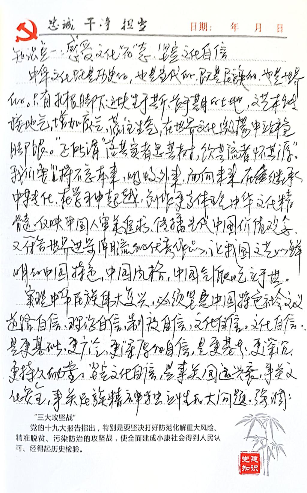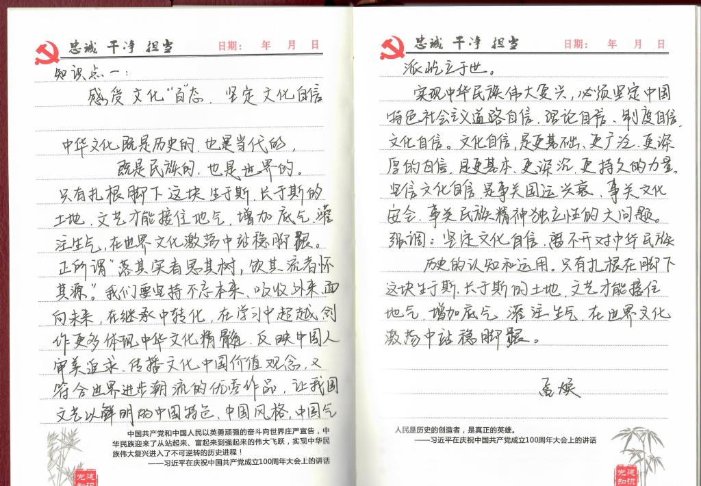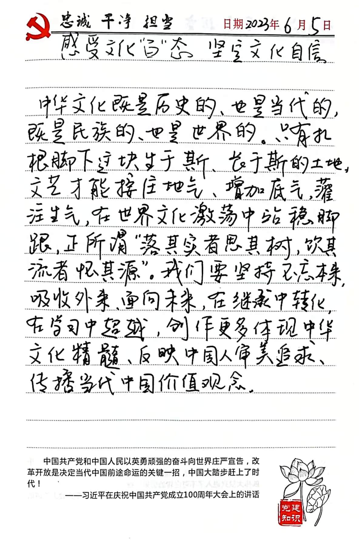 通过本次学习,我深刻地认识到文化自信的重要性。我们党始终坚定不移地倡导和强调文化自信,鼓励广大人民群众弘扬民族文化。作为一名党员,我们更应该积极践行文化自信,在感受文化“百”态的同时,不断坚定我们的文化自信,让党的精神文明建设得到更好地发展,为我们伟大祖国的繁荣富强作出自己的贡献。