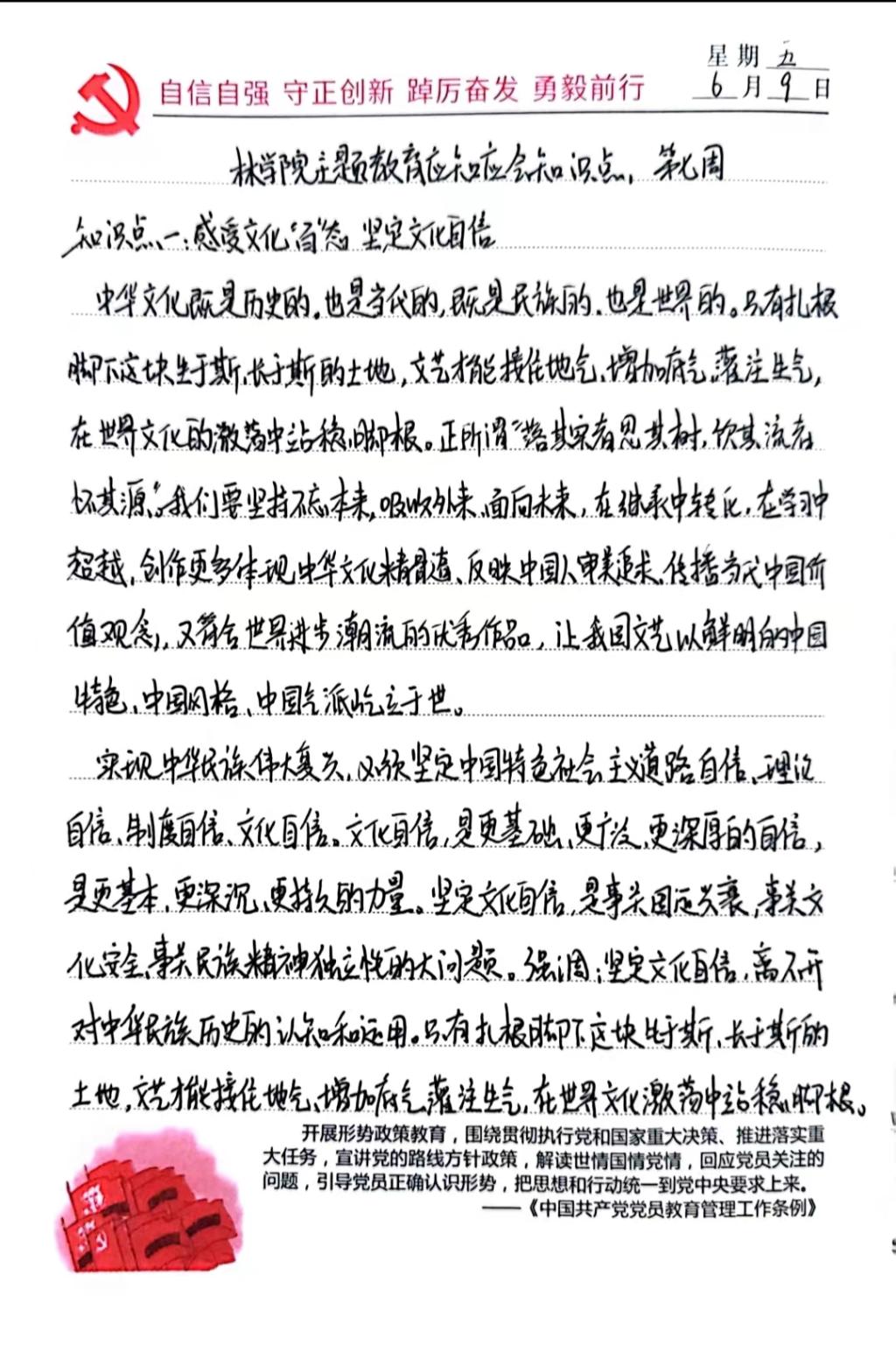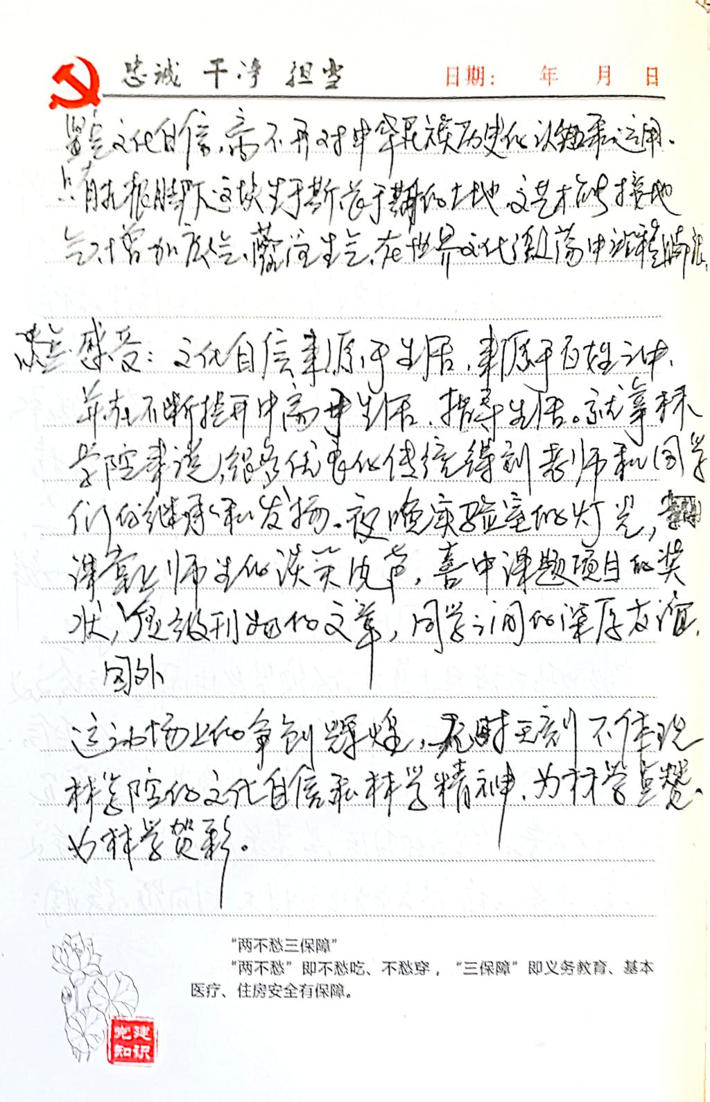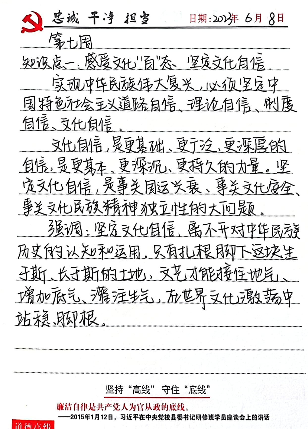 通过本次学习,我深刻地认识到文化自信的重要性。我们党始终坚定不移地倡导和强调文化自信,鼓励广大人民群众弘扬民族文化。作为一名党员,我们更应该积极践行文化自信,在感受文化“百”态的同时,不断坚定我们的文化自信,让党的精神文明建设得到更好地发展,为我们伟大祖国的繁荣富强作出自己的贡献。