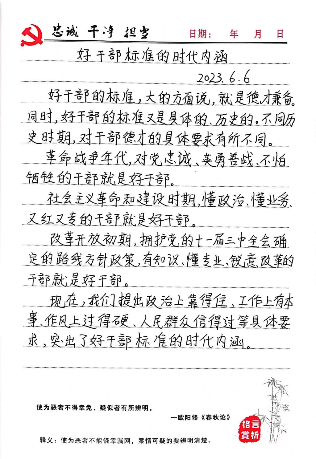 通过这次主题教育的系统学习,我对习近平总书记提出的20字好干部标准又有了新的认识。作为一名党员教师,应认真对照20字好干部标准,坚持知行合一、躬身笃行、指导实践、推动工作。我们要向优秀的老党员学习,向优秀的党务工作者学习,以更高标准、更严要求约束和管理自己,经常用党章规定、用上级党组织的部署要求时刻鞭策自己、端正自己,不断坚定共产主义理想和社会主义信念。