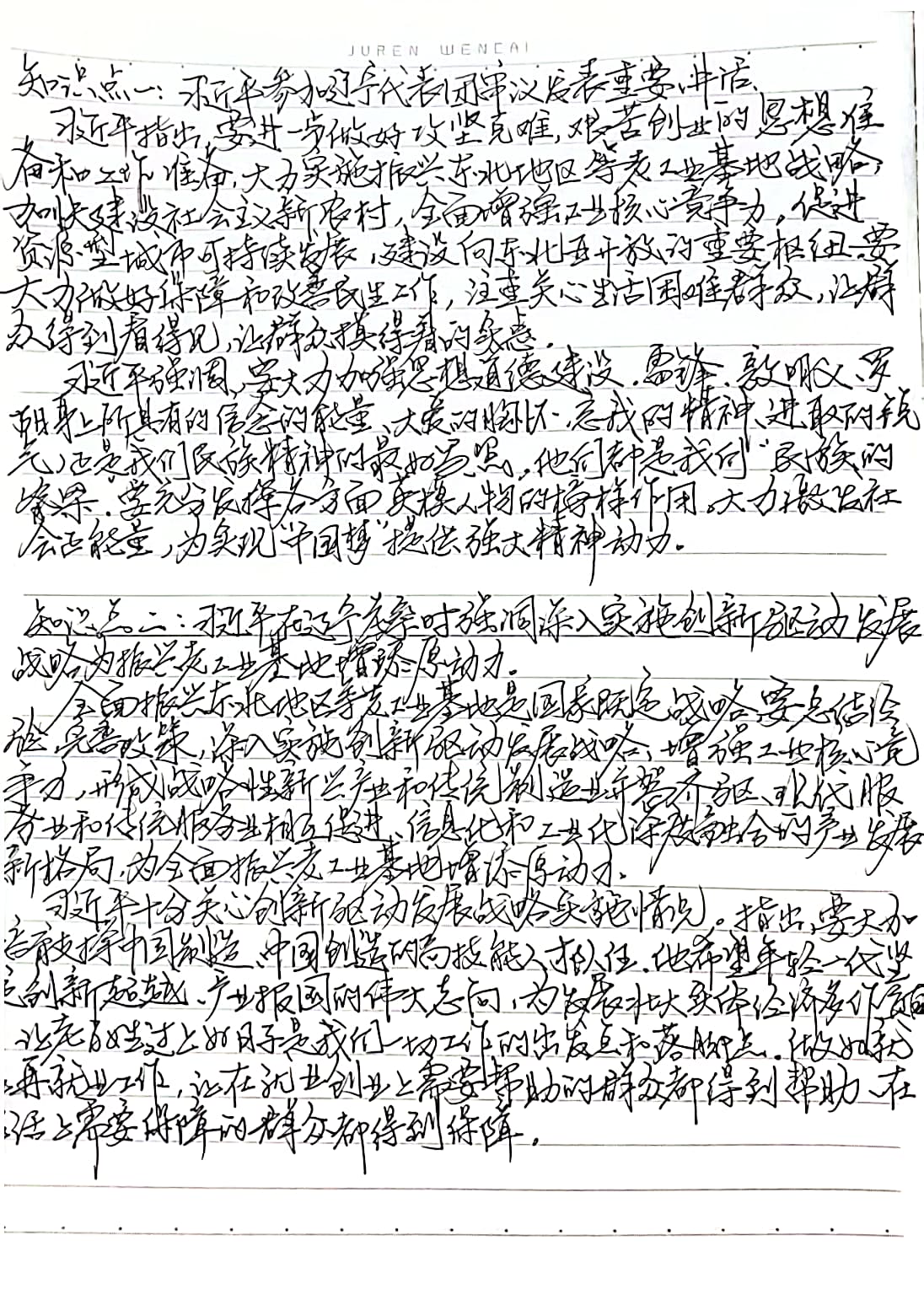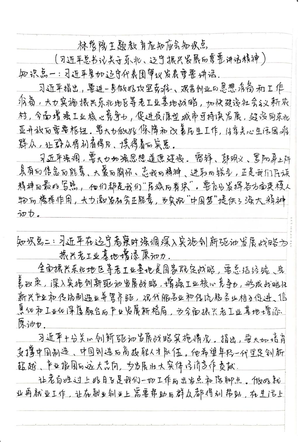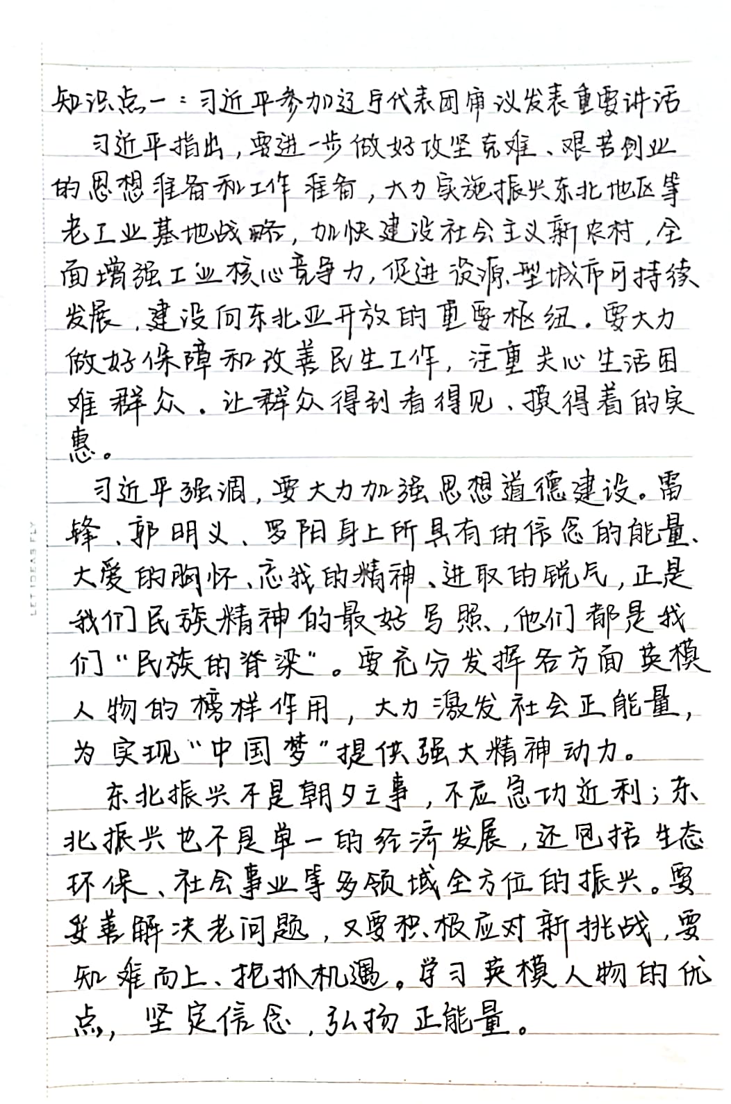通过学习习近平总书记关于东北、辽宁振兴发展的重要讲话精神,让我明白振兴东北、振兴辽宁的重要性。全面振兴东北地区等老工业基地是国家既定战略,作为学生党员,我们要跟紧时代脚步,跟紧党中央号召,要讲诚信、懂规矩、守纪律、襟怀坦白、言行一致、心存敬畏、手握戒尺,对党忠诚。