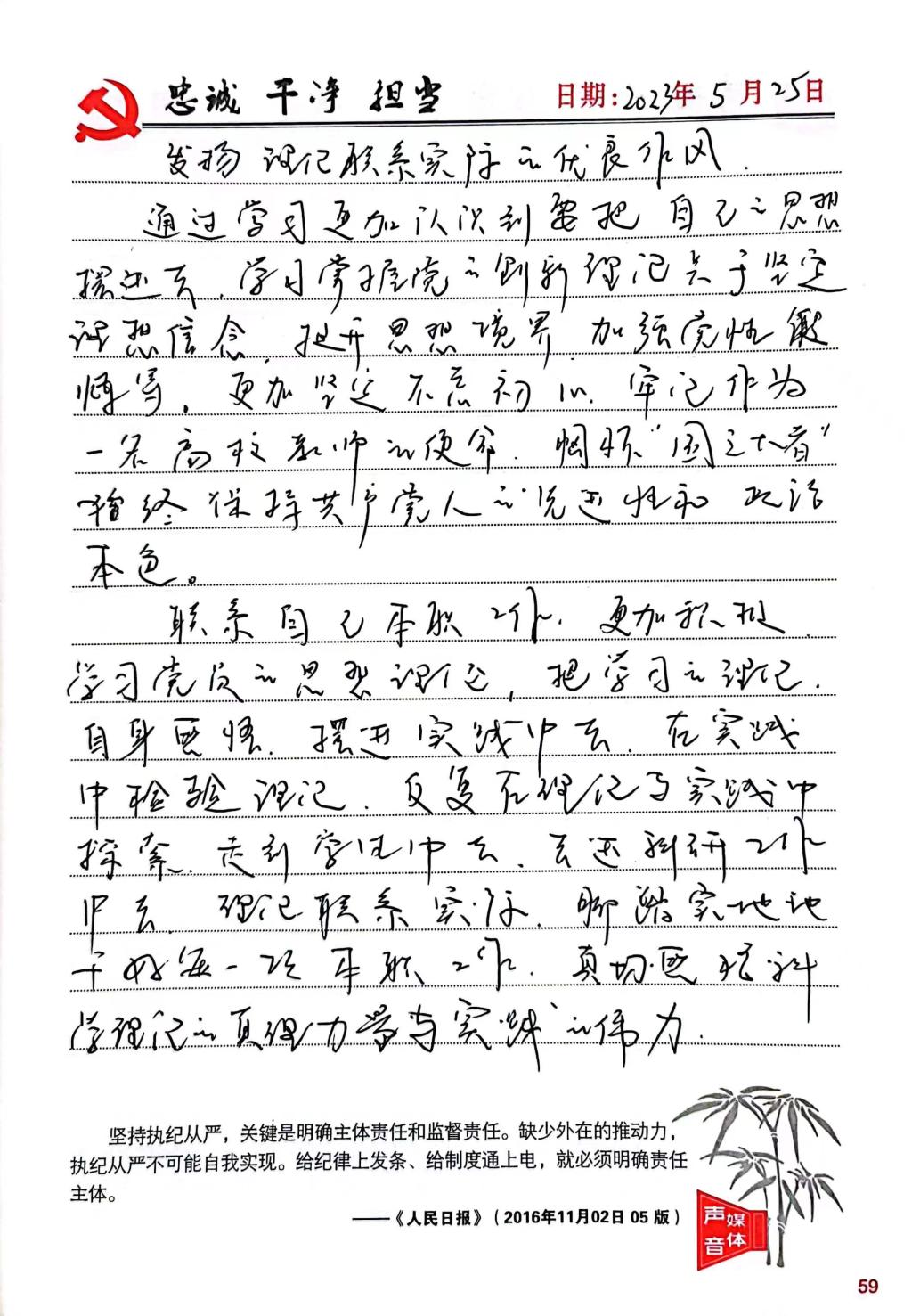 坚持实事求是,一切从实际出发,理论联系实际是马克思主义最基本的原则,是我们党的优良作风。百年风雨兼程,百年砥砺奋进。理论联系实际的优良作风,伴随着我们党走过百年征程。作为一名高校教师,在工作中,应做到知行合一,不论是教学还是科研都应该脚踏实地,弘扬理论联系实际的优良作风,“不忘初心、牢记使命”、实干担当、奋斗前行,使自己的思想和工作不断进步。